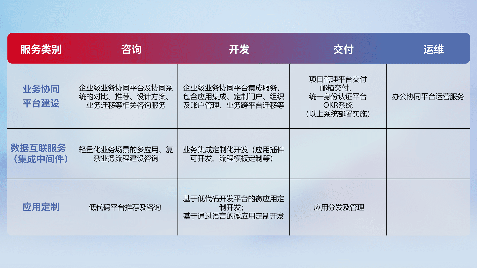 针对钉钉、、、企微、、、、IDaas等平台级产品提供产品的规划、、方案、、、、交付、、定制化开发等服务,,,,实现如统一协同办公、、、智能客户服务、、混合会议管理、、、智能数据查询、、、等业务场景,,,实现数字化转型。。。
