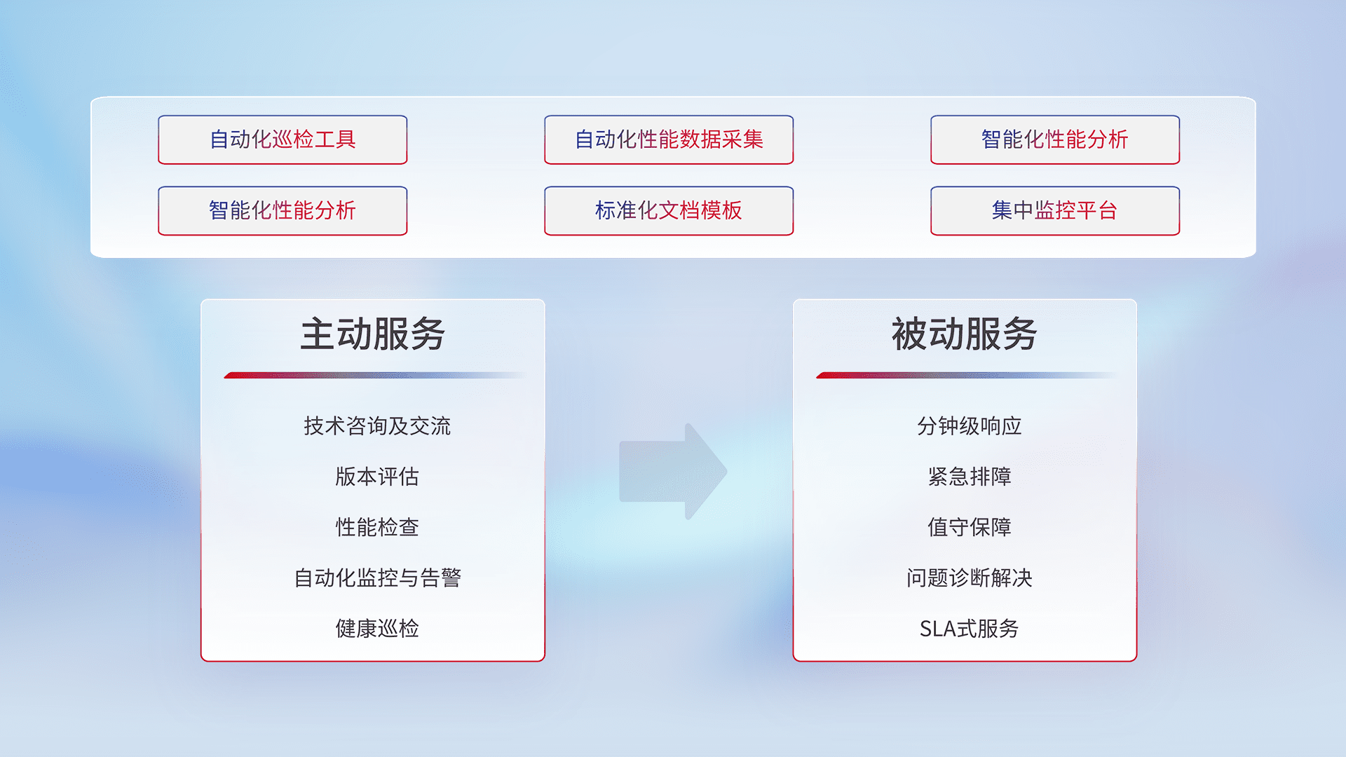 智能化工具和标准化文档,,保障服务质量,,,提供主动服务(包含技术咨询、、、版本评估、、、、性能检查、、、、自动化监控与告警、、、健康巡检)和被动服务包含(分钟级响应、、、紧急排障、、、、值守保障、、、、问题诊断解决、、、、SLA服务)。。。
